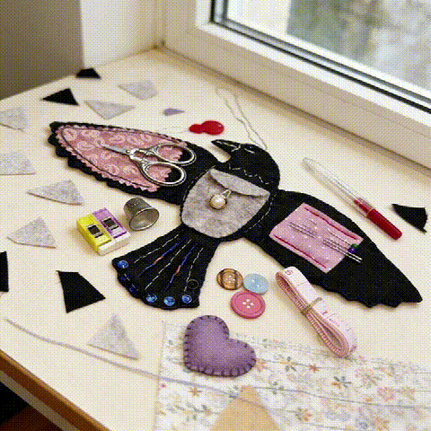 This isnโt just a storage pouch. Itโs a tiny story stitched by your hands. A guardian of scissors. A keeper of needles. A stylish little crow who takes her job very seriouslyโฆ even if she looks a bit dramatic about it.